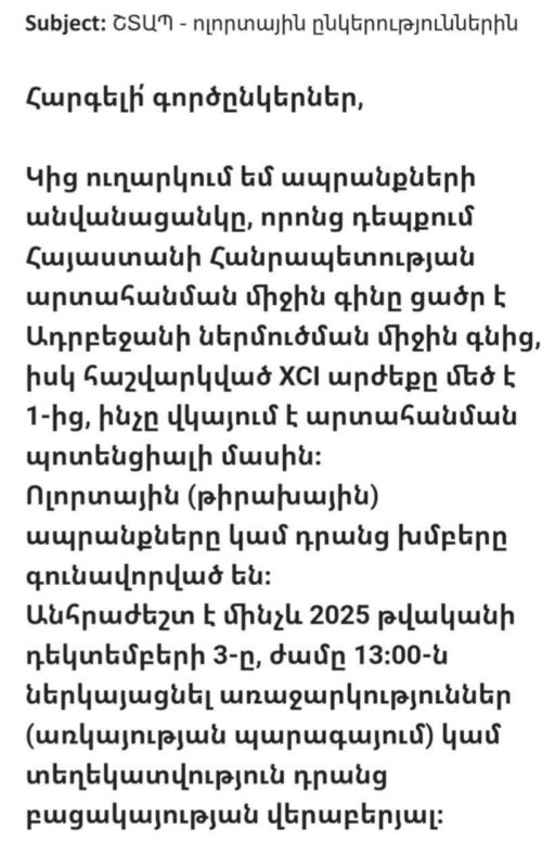 Էկոնոմիկայի նախարարության նամակի մեզ հասանելի դարձած հատվածում մասնավորապես ասված է․ «Կից ուղարկում եմ ապրանքների անվանացանկը, որոնց դեպքում ՀՀ արտահանման միջին գինը ցածր է Ադրբեջանի ներմուծման միջին գնից, իսկ հաշվարկված XCI արժեքը մեծ է 1-ից, ինչը վկայում է արտահանման պոտենցիալի մասին։ Ոլորտային (թիրախային) ապրանքները կամ դրանց խմբերը գունավորված են։ Արնհարժեշտ է մինչև 2025 թվականի դեկտեմբերի 3-ը, ժամը 13։00-ն ներկայացնել առաջարկություններ (առկայության պայմաններում) կամ տեղեկատվություն դրանց բացակայության վերաբերյալ»։