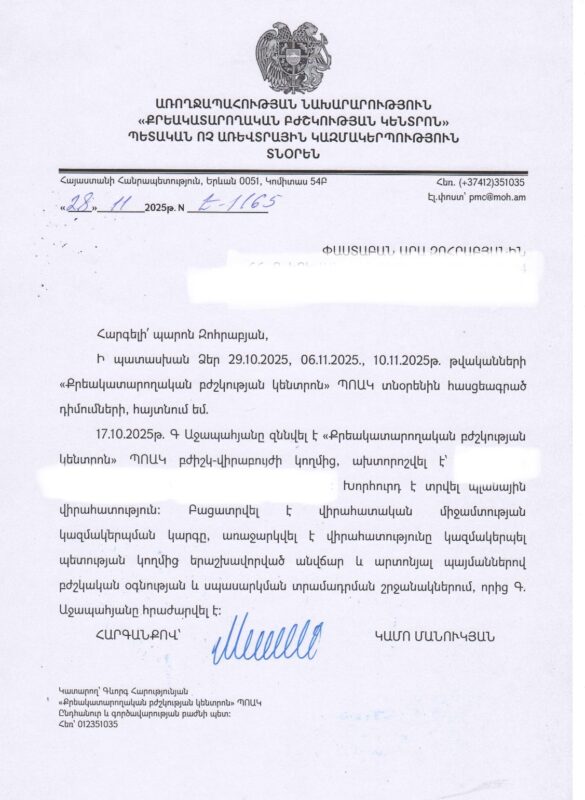 «ՀՀ կառավարության 2006 թվականի մայիսի 26-ի N 825-Ն որոշմամբ հաստատված կարգով ղեկավարվելով և նկատի ունենալով այն հանգամանքը, որ Միքայել Սրբազանը ցանկություն է հայտնել իր միջոցների հաշվին վիրահատվել «Իզմիրլյան» բժշկական կենտրոն ՓԲԸ-ում՝ 07.10.2025թ. Միքայել Սրբազանի պաշտպան Արա Զոհրաբյանի կողմից դիմում է հասցեագրվել ՀՀ ԱՆ Քրեակատարողական ծառայությանը՝ ակնկալելով միջոցներ ձեռնարկել Միքայել (Գևորգ) Աջապահյանի վիրահատությունը կազմակերպելու, այդ թվում՝ Միքայել արք. Աջապահյանի համաձայնությունը «Քրեակատարողական բժշկության կենտրոն» պետական ոչ առևտրային կազմակերպությանը փոխանցելու կապակցությամբ: Այնուհետև, Միքայել Սրբազանի պաշտպանի կողմից 29.10.2025թ., 06.11.2025թ. և 10.11.2025թ. «Քրեակատարողական բժշկության կենտրոն» ՊՈԱԿ-ին հասցեագրվել են դիմումներ»,-նման հայտարարություններ են տարածել Միքայել Սրբազանի փաստաբանները՝ արձագանքելով արդարադատության նախարարի պաշտոնը զբաղեցնող Սրբուհի Գալյանի հայտարարություններին։