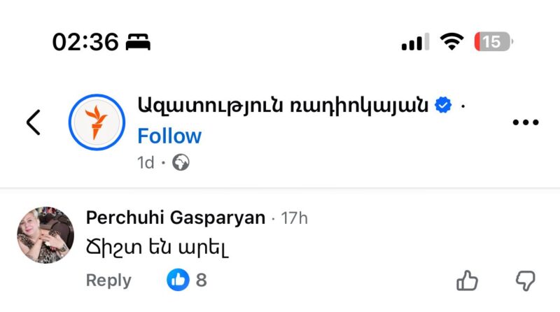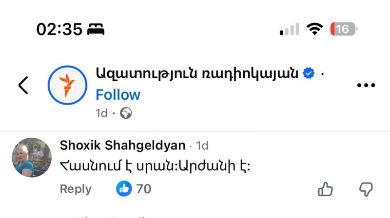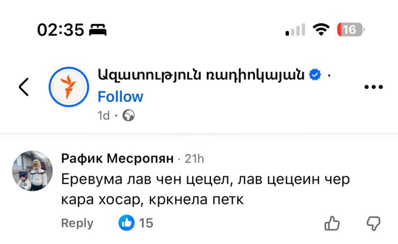 Կից ներկայացնում եմ բռնությունն արդարացնող մեկնաբանություններ, որոնք կատարել են ԻՐԱԿԱՆ ՕԳՏԱՏԵՐԵՐԸ՝ ընդդիմադիր գործիչ Միհրան Հակոբյանի դեմ հարձակման վերաբերյալ իմ ճեպազրույցը լուսաբանող միայն մեկ լրատվականի («Ազատություն» ռադիոկայանի) պատրաստած ռեպորտաժի տակ։ Նյութի հղումը՝ https://www.facebook.com/share/v/1BvjzAzD8J/?mibextid=wwXIfr