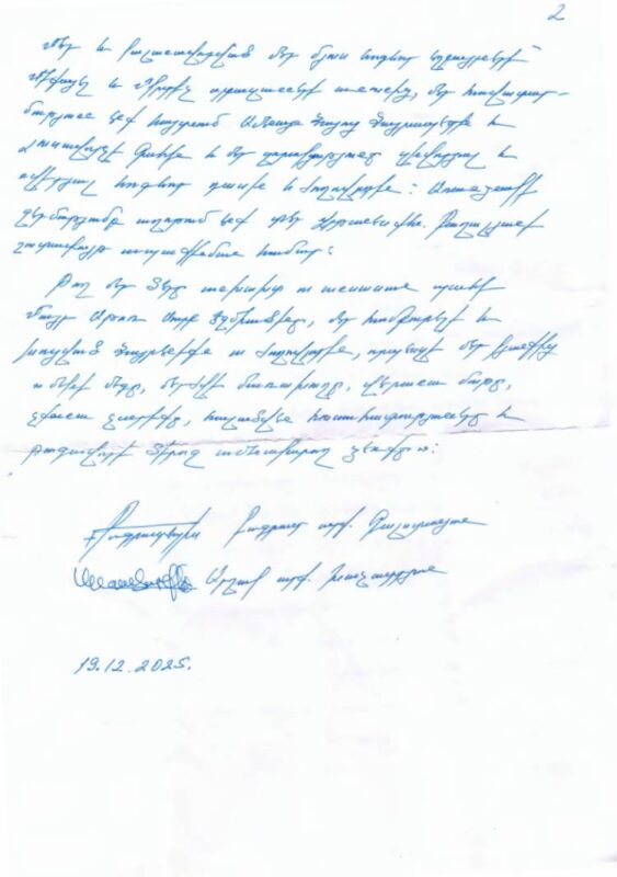 Մեր և կալանավորված մեր մյուս հոգևոր եղբայրների՝ Միքայել և Մկրտիչ սրբազանների անունից, մեր հավատարմությունն ենք հայտնում Ամենայն Հայոց Հայրապետին և լուսավորչի գահին, և մեր զորակցությունը զինվորյալ և նվիրյալ հոգևոր դասին և ժողովրդին։ Առանձնակի ջերմությամբ աղոթում ենք Տեր Վրթանես Քհն․ Բաղալյանի շուտափույթ ապաքինման համար։