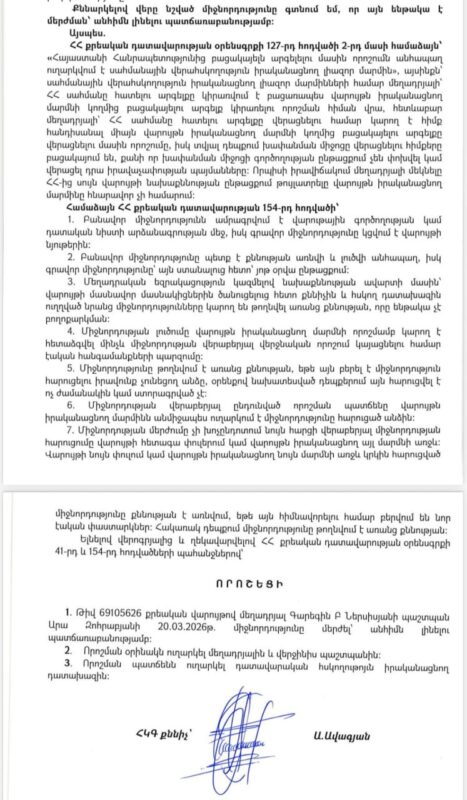 Փաստաբան Արա Զոհրաբյանը հայտնում է, որ քննիչը մերժել է Ամենայն հայոց կաթողիկոսի խափանման միջոցը վերացնելու միջնորդությունը` շեշտելով, որ սա «երկրի վարկանիշը վնասող հերթական ապօրինություն է»։