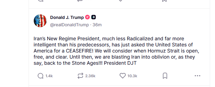 «Իրանի նոր ռեժիմի նախագահը, որն իր նախորդներից շատ ավելի քիչ արմատականացված է և շատ ավելի խելացի, հենց նոր խնդրել է Ամերիկայի Միացյալ Նահանգներին հրադադար։ Մենք կքննարկենք, երբ Հորմուզի նեղուցը լինի բաց, ազատ և մաքուր։ Մինչ այդ մենք Իրանը ոչնչացնում ենք կամ, ինչպես ասում են, վերադարձնում ենք քարե դար»,-սոցիալական ցանցի իր էջում գրել է ԱՄՆ նախագահը։