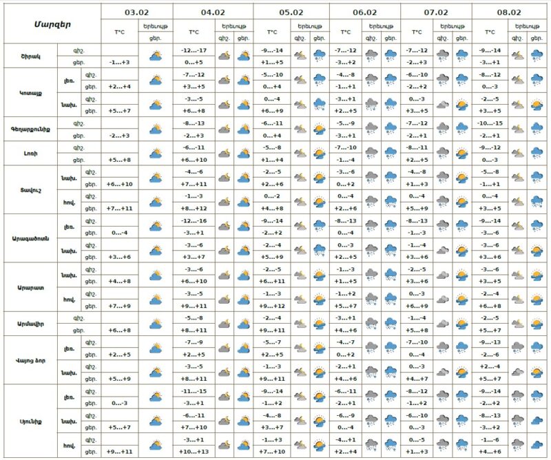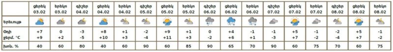 Փետրվարի 4-5-ին, 7-8-ին սպասվում է առանց տեղումների եղանակ: Փետրվարի 6-ին սպասվում է ձյուն։