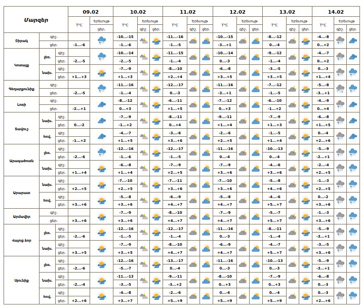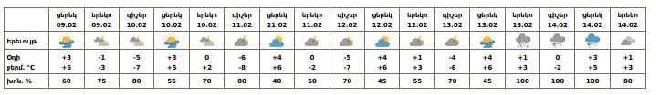 Փետրվարի 13-ի երեկոյան, 14-ի գիշերը շրջանների զգալի մասում, 14-ի ցերեկն առանձին շրջաններում սպասվում է ձյուն։ Փետրվարի 10-12-ին սպասվում է առանց տեղումների եղանակ: Քամին հարավարևելյան 2-5մ/վ։ Օդի ջերմաստիճանը փետրվարի 10-11-ի գիշերն աստիճանաբար կնվազի ևս 2-5 աստիճանով։
